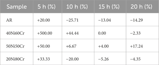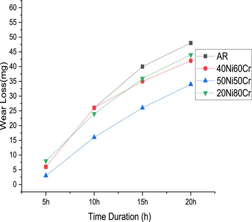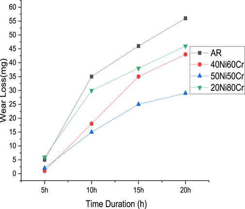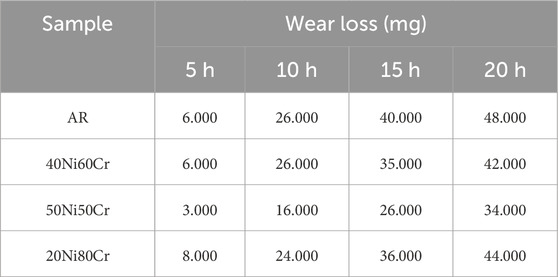 Table 1 and Figure 6 illustrate the wear loss (mg) of different materials over time, showing that all samples experience increasing wear as exposure duration increases. AR (As Received) exhibits the highest wear loss, indicating the poorest wear resistance, while 50Ni50Cr consistently shows the lowest wear loss, making it the most durable material. 40Ni60Cr and 20Ni80Cr demonstrate intermediate wear resistance, with 20Ni80Cr wearing slightly more than 40Ni60Cr over time. The steep initial increase in AR’s wear suggests rapid material degradation, whereas 50Ni50Cr maintains a lower and steadier wear rate. Overall, 50Ni50Cr is the best-performing material, while AR has the least resistance to wear.