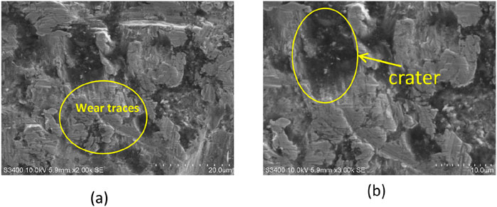 Comparing SEM images, exhibit severely worn-out surfaces and highly irregular surfaces, indicating extensive erosive damage. In Figure 8, the surface appears to have a more granular texture with overlapping plastically deformed regions and occasional fissures. On the other side, the second (Figure 9) shows more pronounced lamellar or flake-like structures, suggesting that material may have peeled away in layers under stress. While both reveal jagged contours and evidence of surface degradation while the first image displays slightly larger, more distinct fragments, implying a potentially more advanced stage of wear. Despite these minor distinctions, both Figures confirm significant damage likely resulting from similar wear mechanisms such as cavitation erosion and abrasive impact.