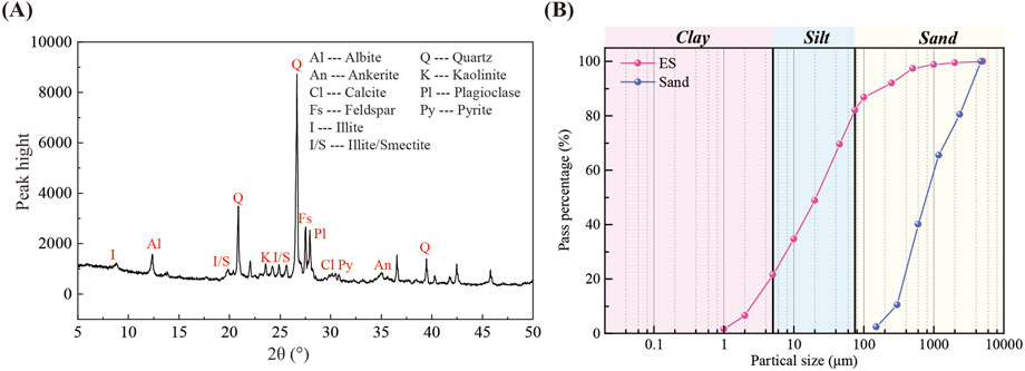 Figure 1. (A) XRD mineral phase analysis spectrum of ES; (B) particle size distribution curves of ES and sand.