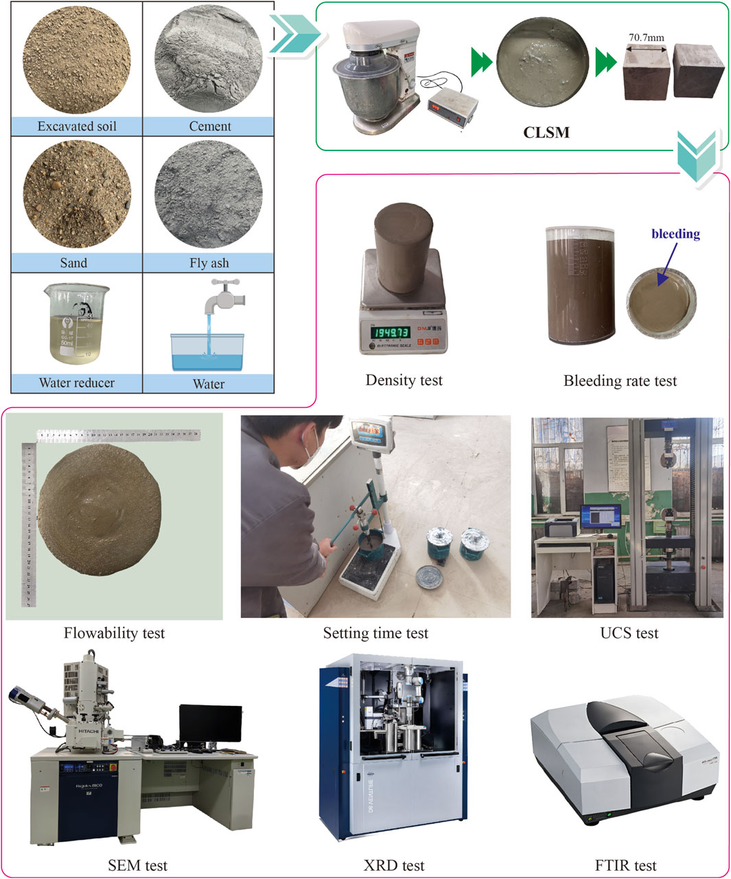 Addressing the research status and limitations, this study aims to develop a practical, and easily scalable preparation technology for soil-based CLSMs. This method uses ordinary Portland cement (OPC) and fly ash as cementitious materials, fully exploits engineering ES as fine aggregates, and incorporates an appropriate amount of construction sand along with a superplasticizer to optimize performance. On this basis, research is conducted that focuses on material properties, mechanisms, and strength prediction models, specifically encompassing the following three aspects. First, the workability properties of CLSMs, including flowability, setting time, bleeding rate, and density, are evaluated, with emphasis on strength characteristics and the establishment of a strength–time relationship model to verify their engineering applicability. Second, multiple characterization methods are employed to elucidate the strength development mechanism of the material system from the perspectives of hydration product evolution and microstructural changes. Finally, a machine learning-based strength prediction model is constructed, and its prediction accuracy is assessed to achieve precise prediction of CLSM strength performance while minimizing experimental input, thereby providing scientific decision-making support for engineering practice.
