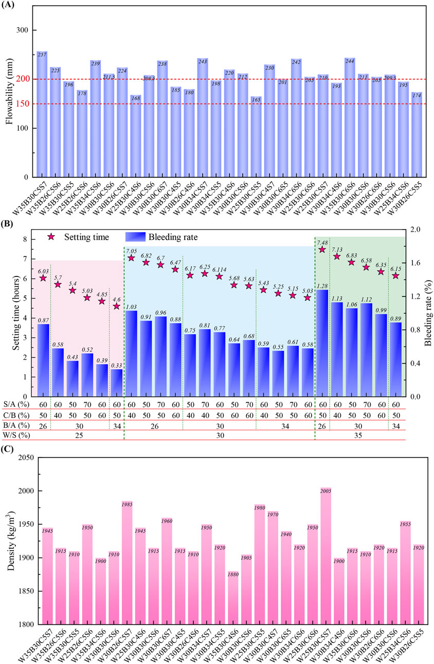 Figure 3. (A) Flowability, (B) setting time and bleeding rate and (C) densities of samples with different mix proportions.