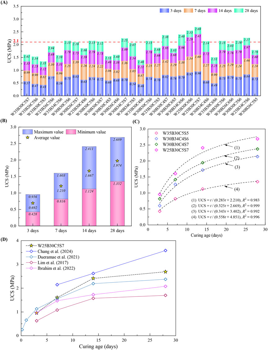 Figure 4. (A) UCS of samples with different mix proportions at various ages; (B) statistical analysis of UCS at different curing ages; (C) strength‒time relationship; (D) comparison of strength‒time relationships.