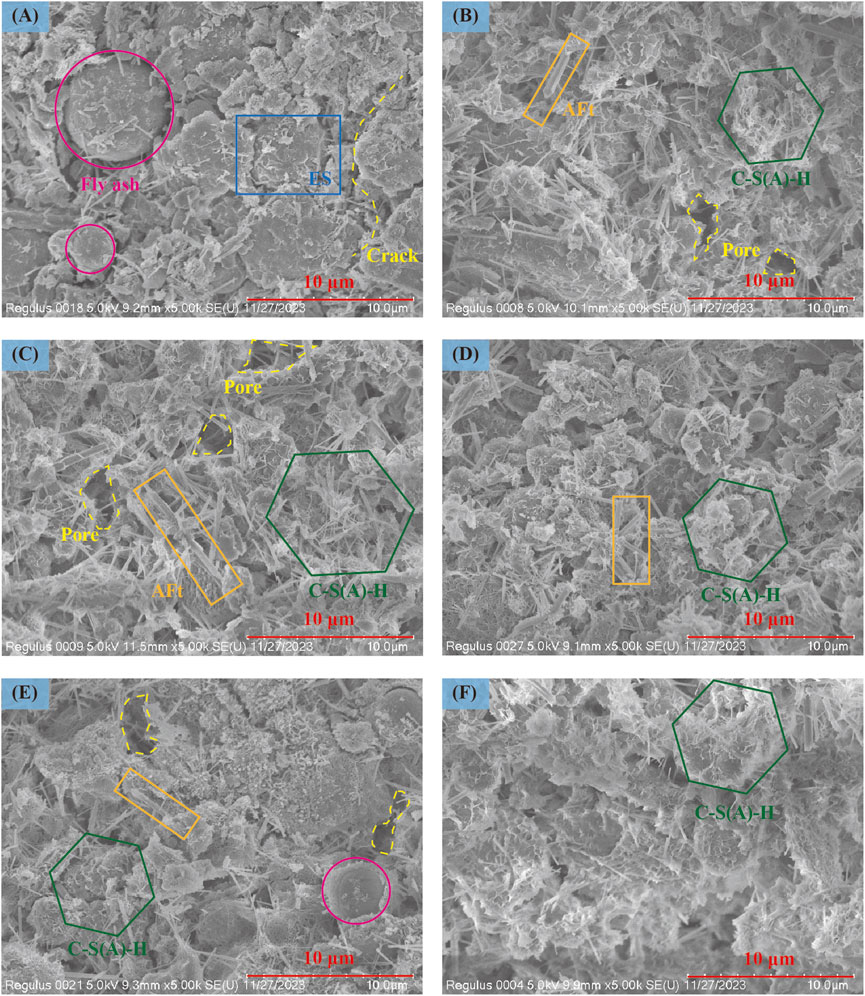 As shown in Figures 5E,F, the SEM images correspond to samples with cement dosages (C/B) of 40% and 60%, respectively. The analysis reveals that at lower cement contents, the quantity of cementitious products is relatively limited, and these products predominantly exhibit a needle-like morphology with fewer reticular and fibrous structures. Additionally, unreacted or partially hydrated fly ash particles are observed, resulting in increased porosity and a relatively loose overall structure. As the cement content increases, the alkalinity of the system is enhanced, which further promotes the hydration of fly ash and leads to the formation of more abundant cementitious products. These products primarily form interlaced reticular and fibrous structures, significantly reducing porosity and improving the overall integrity and compactness of the samples, thereby enhancing their mechanical strength.