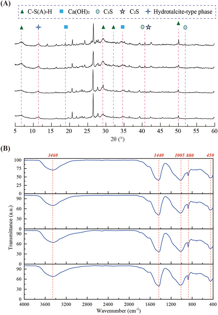 The hydrotalcite-type phase observed in the figure exhibits distinct diffraction characteristics, primarily originating from fly ash, with a small portion derived from cement. As the curing age increases, the intensity of its characteristic peaks gradually decreases, and peak broadening occurs. This phenomenon is attributed mainly to ion exchange between the hydrotalcite phase and other anions in the surrounding environment (especially CO32-) during the curing process. Such exchange and rearrangement disrupt the original periodic arrangement of the interlayer channels, thereby reducing the structural order of the crystals. Additionally, the accompanying carbonation process further leads to the weakening, broadening, and even splitting of the characteristic peaks. This inference is consistent with the subsequent FTIR test results.