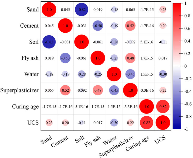 A complete dataset was constructed by integrating the quantities of the components and curing age with the corresponding compressive strength data. To further investigate the relationships between each variable and strength, the Pearson correlation coefficient was employed to quantitatively analyse the correlation between each variable and compressive strength (Zhao et al., 2024a), as shown in Figure 8.