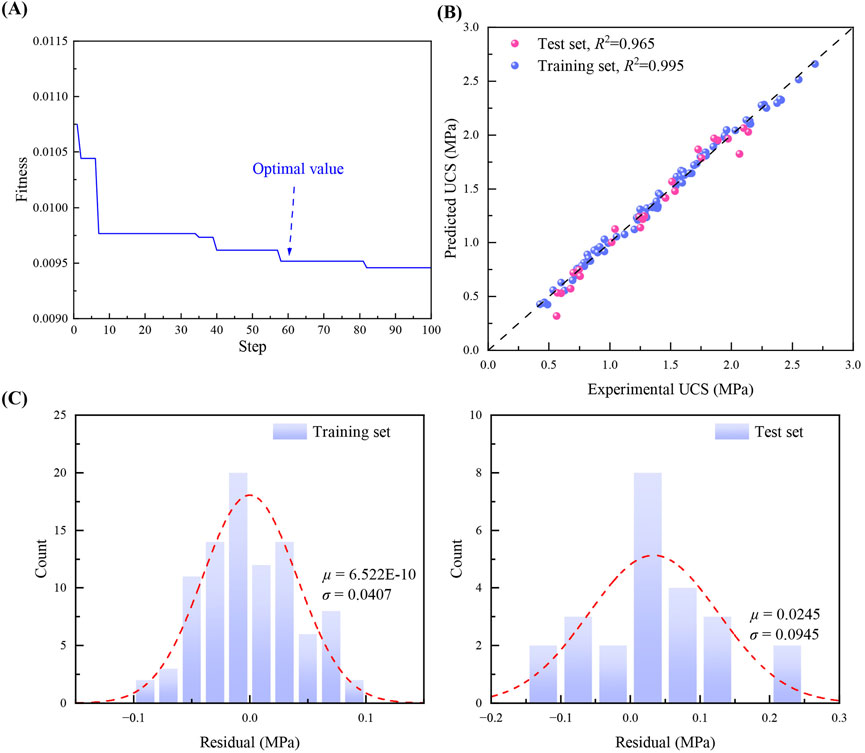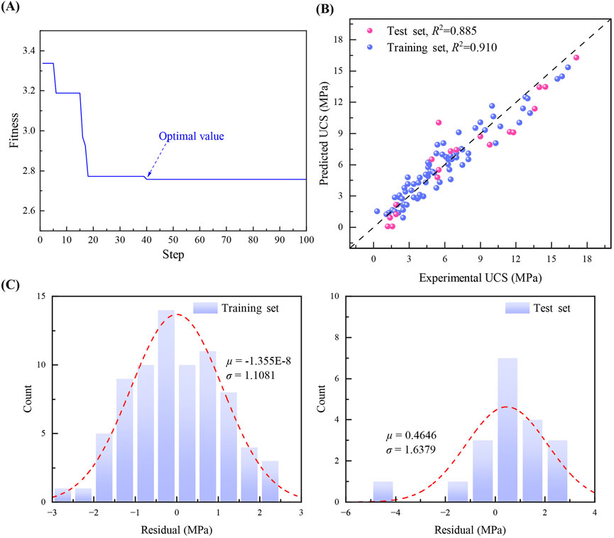 The developed NRBO-LightGBM hybrid model was used for training and prediction analysis on the dataset, and the prediction results for both the training and test sets were evaluated. Figure 9B shows the comparison between the actual UCS values and the values predicted by the NRBO-LightGBM model, while Figure 9C presents the histogram distribution of the residuals.