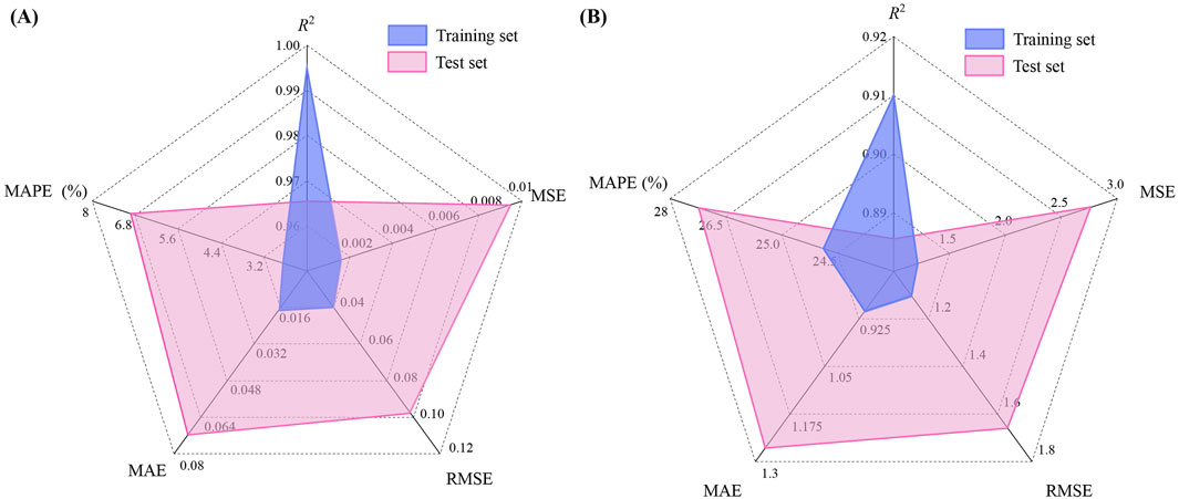 Figure 10. Radar plot of performance metrics for training and test sets: (A) dataset of this study; (B) dataset from the literature.