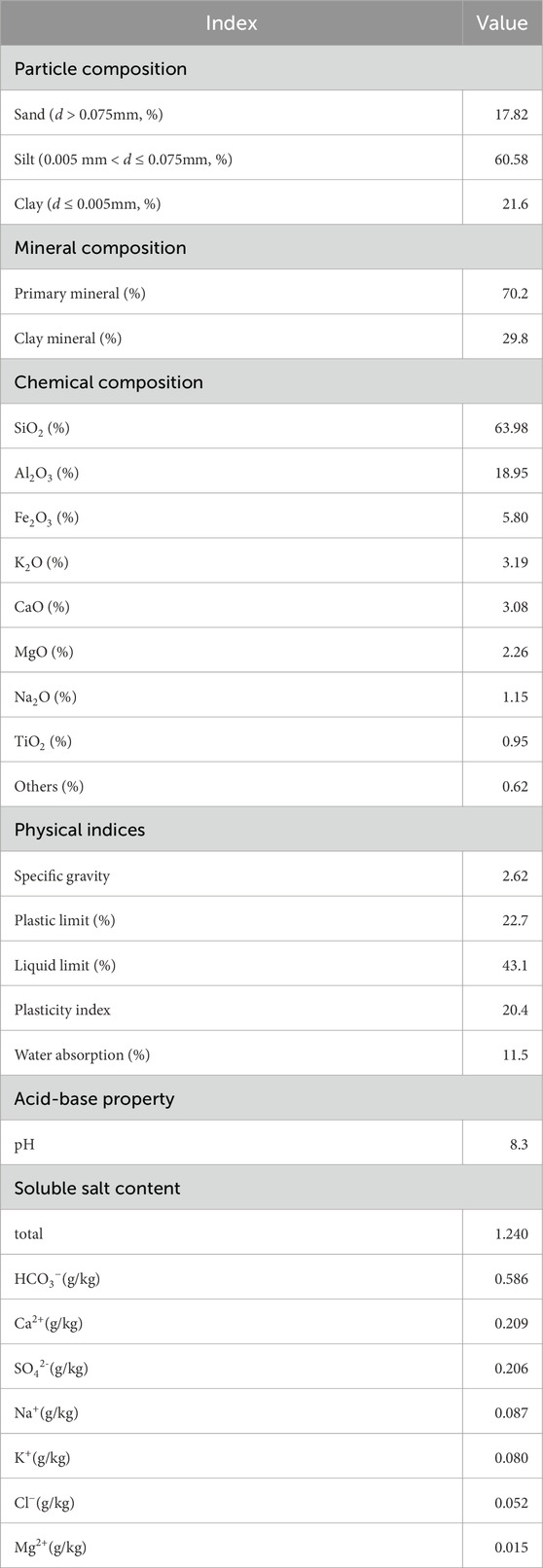 The soil samples used were obtained from the foundation pit excavation during the open-cut construction of Anxin Road Station on Changchun Metro Line 5. The sampling point was located at 125°14′22″ E, 43°48′25″ N. After collection, the soil samples were first subjected to impurity removal, eliminating non-soil components such as construction debris and plant roots. Systematic testing was subsequently conducted to evaluate the physical properties and mineral composition of the soils, with the relevant data presented in Table 1; Figure 1A. The particle size distribution analysis results are shown in Figure 1B, which indicate that the mass proportion of fine particles smaller than 0.075 mm in the soil is 82.2%. According to geotechnical classification standards, this soil is classified as silty clay. Mineral composition analysis revealed that the content of primary minerals (such as quartz and feldspar) in the soil is 70.2%, while clay minerals account for 29.8%. Among the clay minerals, illite and montmorillonite mixed layers are predominant.