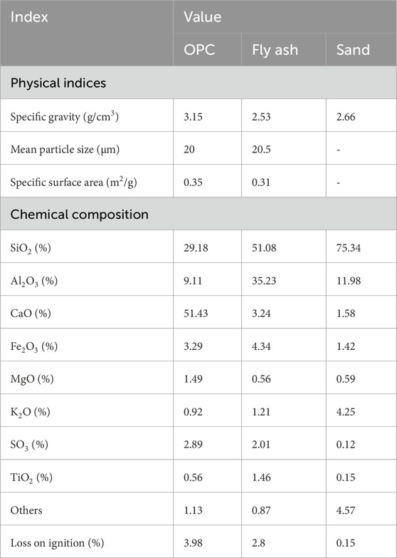 This study employed Dinglu brand OPC (P.O., strength grade 42.5) produced by Jilin Yatai Cement Co., Ltd. The fly ash used was laboratory-grade Class F fly ash, supplied by Zhengzhou Yuzhong Power Plant Fly Ash Development Company. Both materials comply with the relevant standard requirements of ASTM C150/C150M-17 (2017) and ASTM C618-19 (2019), respectively. The primary chemical compositions of the materials are detailed in Table 2.