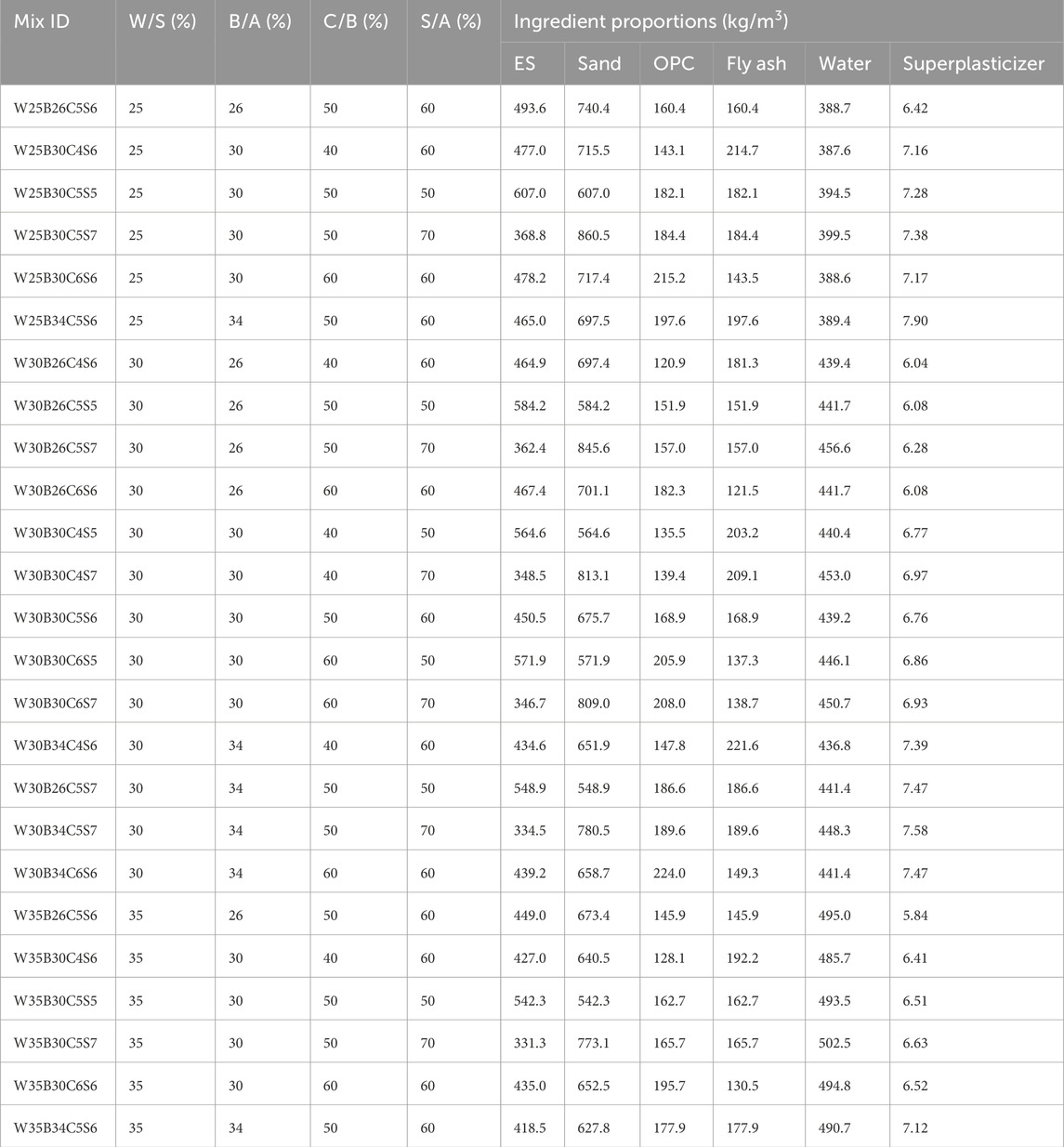 Each mix proportion was identified using an ID code composed of letters and numbers. For example, the ID code “W25B26C5S6” represents a mix proportion with a W/S ratio of 25%, B/A ratio of 26%, C/B ratio of 50%, and S/A ratio of 60%. In this code, the uppercase letters denote the initial of each variable, while the numbers indicate the corresponding values, with the percentage sign omitted.