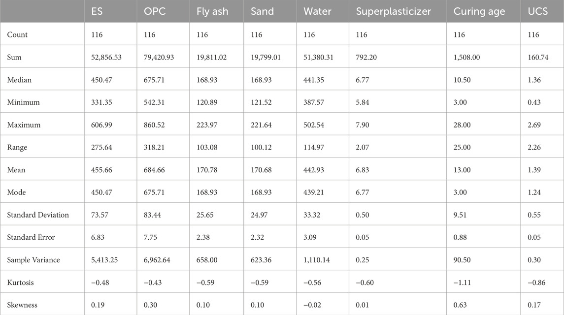 In this study, the quantities of each component per cubic metre of the material system, including ES, sand, cement, fly ash, water, and superplasticizer, were used as the main input variables. In addition, the curing age, a key factor affecting the development of strength, was also incorporated into the dataset for analysis, with compressive strength as the output variable.