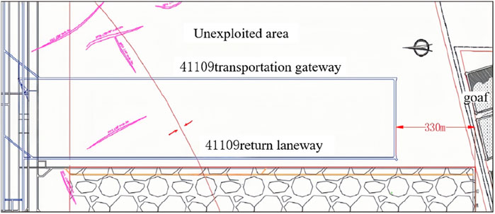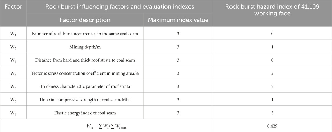 Regarding the definition of coal seam mining depth, the traditional view holds that when the mining depth exceeds 500 m, the coal seam is considered to enter deep mining. However, Xie et al. (2012) proposed to define the mining depth from the perspective of stress environment. With the increase of depth, the risk coefficient of rock burst disasters changes nonlinearly. Studies have shown that the stress environment of surrounding rock changes significantly with the increase of mining depth. Even in different mining areas of a mine field, the possibility of rock burst varies greatly. According to the distribution of coal seam burial depth in the working face area, the coal seam depth in the mining range of the 41,109 working face of Dafosi Coal Mine was 436–521 m. According to the engineering analogy of mines with known rock burst occurrences, the burial depth of the 41,109 working face had reached the critical depth for rock burst occurrence, and the risk of rock burst was greatly increased.