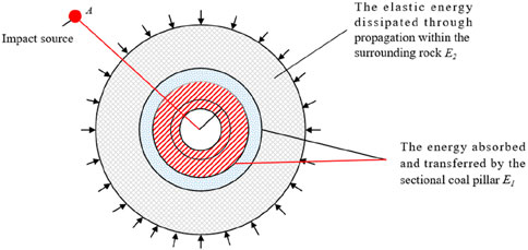 As shown in Equation 4, to prevent tunnel instability and failure after impact loading, the energy absorption and transfer characteristics of the sectional coal pillar can be utilized. Reducing the width of its plastic zone enhances its inherent stability, thereby strengthening its energy absorption and transfer capacity and eliminating the destructive effects of residual energy on the tunnel. The specific characteristics of internal energy transfer, absorption, and release within the composite support system for tunnel surrounding rock are illustrated in Figure 2.