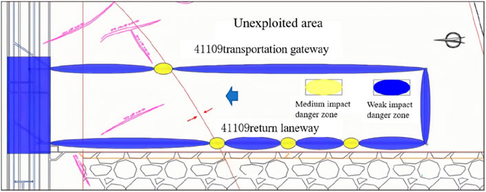 Combined with the rock burst initiation theory and the evaluation results of the rock burst hazard level of the 41,109 working face, it was found that although the mining working face had weak rock burst hazard, the risk of rock burst in the working face was increased due to factors such as mining disturbance, geological structure, and coal seam occurrence characteristics. Moreover, the superposition of “dynamic and static loads” was the main inducing factor. The rock burst hazard areas of the 41,109 working face were drawn through comprehensive analysis, as shown in Figure 3.