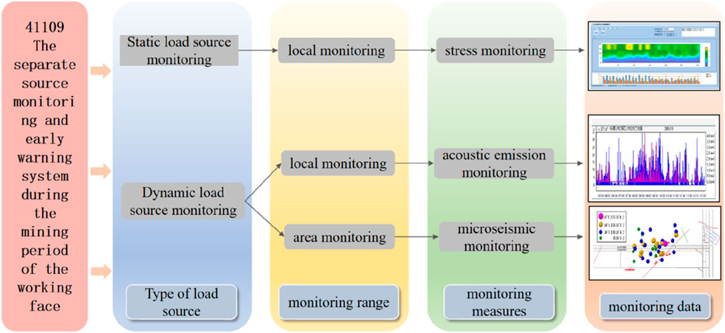 The surrounding rock stress monitoring could conduct real-time monitoring on the concentrated static load sources causing rock burst in local areas. Therefore, for the rock burst prevention and control work during the mining period of the 41,109 working face in Dafosi Coal Mine, it was divided from three angles: load source type, monitoring range, and monitoring method. A separate source monitoring and early warning system for rock burst with “regional monitoring combined with local monitoring” was established for static and dynamic load sources (Figure 4).