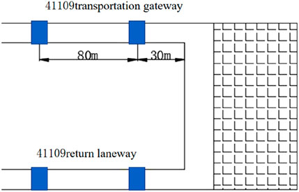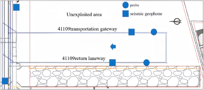 The ARAMIS M/E microseismic monitoring system could be used to monitor the energy release from hard roof fracture. Microseism was used to monitor the high-frequency sound waves emitted by underground roof fracture or rock stratum vibration. Real-time feedback of monitoring data was used to monitor and warn rock burst hazards. To meet the needs of microseismic monitoring, the geophones and probes of the microseismic system were arranged in a rhombus pattern and adjusted in a timely manner as the working face advanced. One microseismic geophone and one microseismic probe were arranged in the transport roadway and return airway of the 41,109 working face respectively, and the geophones and probes were arranged in a rhombus pattern as far as possible (Figure 5). The distance between probes was 200–500 m, and the distance between geophones was 800–1000 m.
