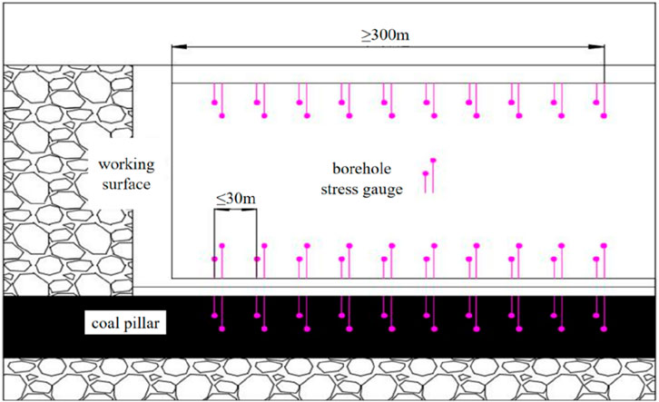The KJ649 stress monitoring system was used to monitor the local static load during the mining of the working face. During the mining of the working face, the layout range of monitoring points was no less than 300 m in front of the working face, which was arranged in the two roadways of the working face. The distance between monitoring groups was no more than 30 m, and two borehole stress gauges were arranged in each group (Figure 7). The depths of the boreholes were 9 m and 14 m respectively, and the distance within the group was 1.5 m, which was used to monitor the variation of mining-induced stress during the mining process of the working face.
