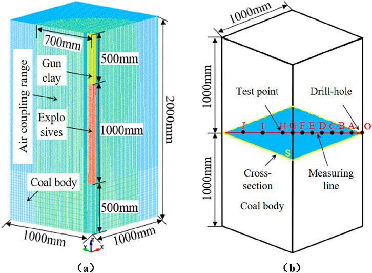 To ensure the accuracy of the blasting simulation results, the following assumptions are made for the established numerical model: ① The coal body is assumed to be isotropic, meaning its physical and mechanical properties are homogeneous and continuous; ② The self-weight of the coal body is neglected; ③ The permeation of blast gases within the coal mass during detonation is disregarded; ④ No heat exchange occurs within the blast products; ⑤ Partial surfaces in the numerical model are defined as non-reflective boundary conditions, simulating an infinitely large underground coal mass within a finite computational domain.