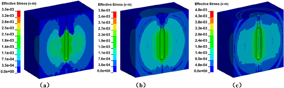 Single-hole blasting models with charge diameters of Φ65 mm, Φ75 mm, and Φ95 mm were sequentially established and submitted to the LS-DYNA Solver for successive calculations. To more clearly observe shock wave propagation at different time points, the upper half of the quarter model was removed from the plane perpendicular to the blast hole at Z = 1,000 using the Blank function in the LS-PREPOST menu, enabling observation of shock wave evolution over time. Figure 9 shows the pressure evolution of shock waves after blasting for models with different charge diameters.