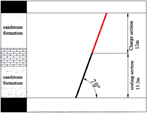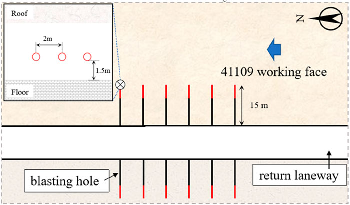 According to the coal seam occurrence environment and the situation of adjacent working faces, it was known that the sudden release of elastic potential energy accumulated in the roof strata during the mining process increased the stress concentration degree of the surrounding rock and increased the number of unstable factors. To weaken the dynamic load effect of the hard roof, pre-blasting was adopted to reduce the release intensity of the roof elastic energy. The specific implementation measures are shown in Figure 10.
