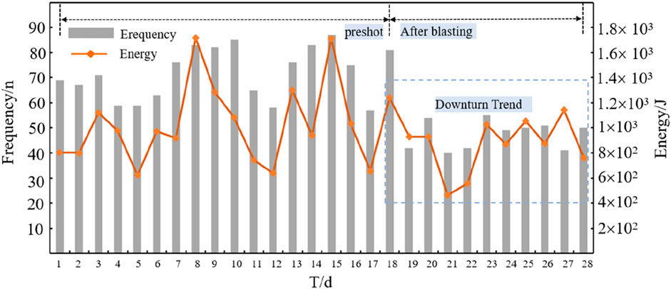 Figure 12. Energy frequency characteristics of microseismic events before and after roof pre blasting.