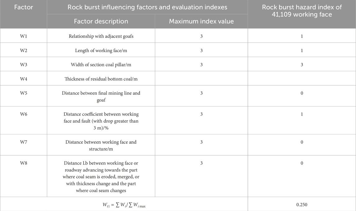 Table 3. Geological factors and rock burst hazard index during mining period of 41,109 working face.