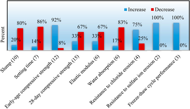 In studies of mechanical properties, numerous findings indicate that concrete made with seawater sea sand experiences a slight increase in compressive strength during the first 7 days compared to freshwater river sand concrete (Pan et al., 2021). However, after 28 days of curing, its compressive strength typically falls below that of freshwater river sand concrete (Panchanathan and Paramasivam, 2022). The initial and final setting times of concrete, as well as its workability, significantly affect the construction methods and timeline of concrete structures. Most studies indicated (Lu et al., 2023a) that the initial and final setting times of SWSSC are shorter than those of freshwater river sand concrete.