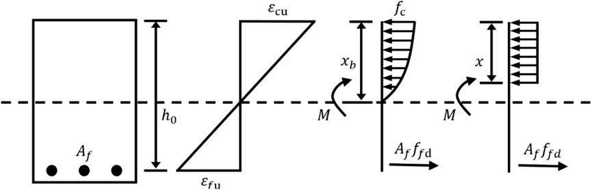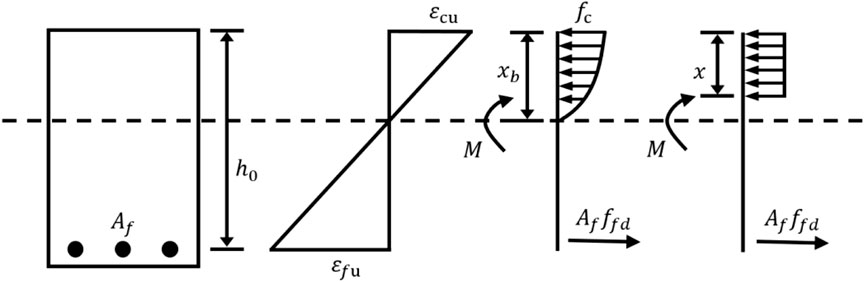 For compression failure, the guideline (GB 50608-2020, 2020) states that when the reinforcement ratio ρf > 1.5ρfb, the flexural member undergoes compression failure, and the flexural capacity can be calculated by the following formulas (Equations 6, 7),