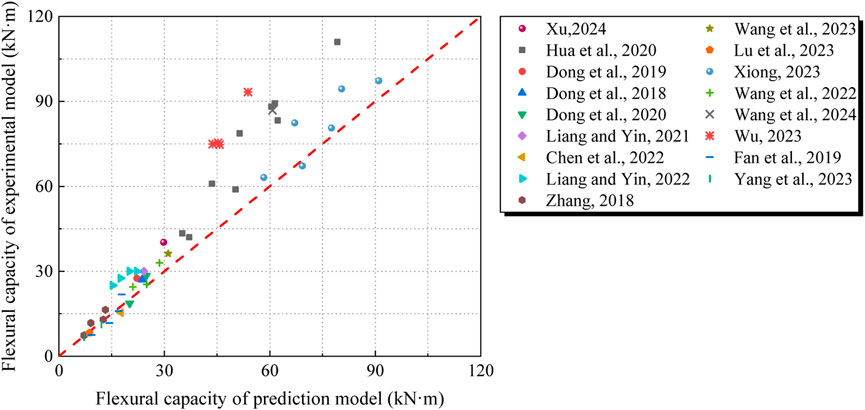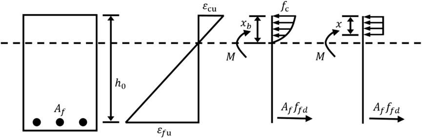 For tensile failure, the guideline (GB 50608-2020, 2020) proposes that when the reinforcement ratio ρf < 1.5ρfb, the flexural member undergoes tensile failure, and the flexural capacity of the is calculated by using Equation 4,
