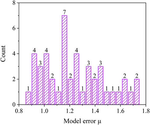 The prediction model was obtained by the theory and the experimental experience, and it inevitably leads to errors in the model. To comprehensively evaluate the reliability of flexural capacity of FRP-SWSSC beams and obtain the appropriate partial factor of SWSSC, the experimental results of 49 FRP-reinforced concrete beams were collected, as shown in Supplementary Appendix 2. The investigated parameters include concrete compressive strength fcu, area of FRP bars Af, elastic modulus Ef, tensile strength ffd, reinforcement ratio ρf, and type of FRP. The distribution of material properties in the database is illustrated in Figure 5. The prediction model introduced in the above section was used to calculate the results corresponding to these parameters, and the model error μ is defined as Equation 8,