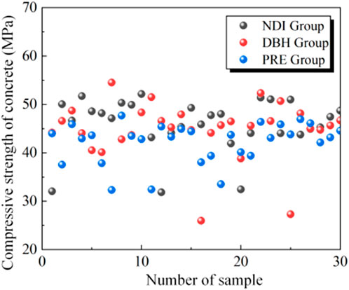In the work of Guo et al. (2020), 90 tests of SWSSC compressive performance were carried out, and the sea sands were from three regions in China (see Figure 8). The strength values ranged from 32.06 to 55.53 MPa. The statistical data were subjected to the K-S test protocol, indicating a good fit to a normal distribution, with none of the data rejecting the normal distribution hypothesis. The variability in the material properties of SWSSC can be represented by Equation 9,