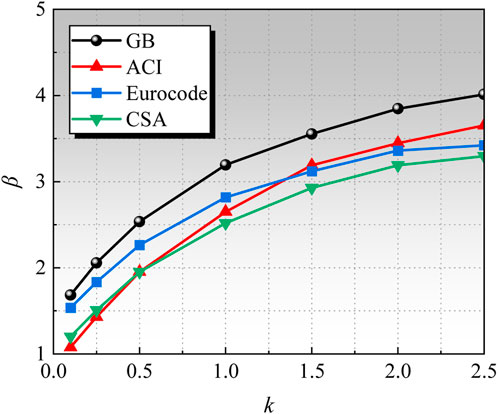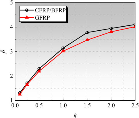 The relationship between the reliability indexes β of different types of FRP and the k value was analyzed, and the results can be found in Figure 13. Generally, the reliability indexes β for GFRP beam under various load effect ratios are lower than those for CFRP and BFRP beams. This phenomenon is attributed to differences in environmental impact coefficients between GFRP and CFRP/BFRP.