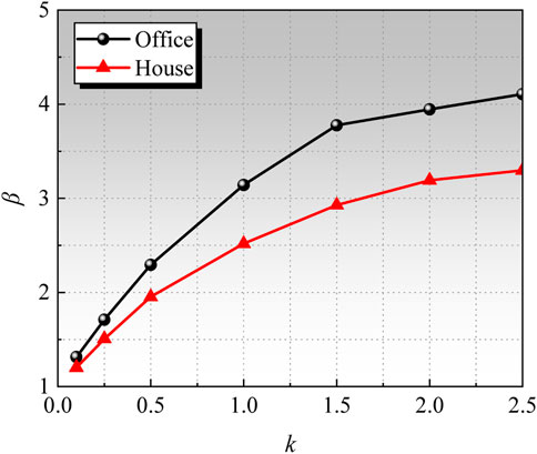 The relationship between the reliability index β under different environments and k value was analyzed, and the results are shown in Figure 14. It can be observed that the reliability index β increases with the increase of the material partial factor, and the rate of increase gradually diminishes. Comparing residential loads with office loads, it is found that the reliability index for office loads is slightly higher at the same value of k. This is mainly due to the larger deviation coefficient of residential loads compared to office loads, while the variation coefficients of both are fairly similar. Consequently, the uncertainty of residential loads is higher, leading to an increased probability of failure and a lower reliability index. In contrast, the office load has a smaller deviation coefficient, and the load values are relatively stable and predictable, resulting in a lower probability of failure and a higher reliability index.