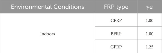 where ffd,k is the standard value of the tensile strength of FRP bars, γfd is the partial factor for FRP bars, with a value of 1.25. γe is the environmental influence factor for FRP bars. The factors γe for different FRP bars under indoor conditions are obtained from Table 1.