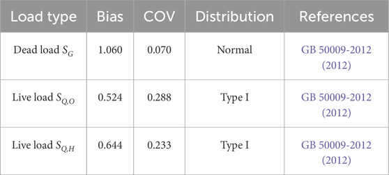According to the GB 50068-2018 (2018), two combinations can be used for analyzing structural reliability, which are SG + SQ,O and SG + SQ,H. SG represents the dead load and SQ denotes the live load, the subscription “O” and “H” denotes office and house environments respectively. Table 3 lists the statistical parameters for the combination of dead load and live load.