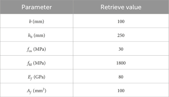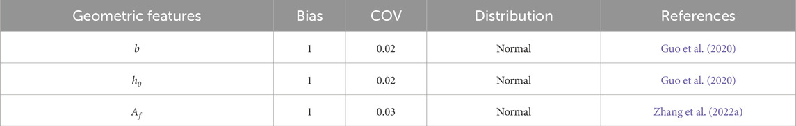 The uncertainties in geometric parameters refer to the deviations in the geometric dimensions of the component cross-section caused by manufacturing and installation, among other reasons. The uncertainties of section width b, effective section height h0, and FRP bar area Af were considered, and the statistical information of these parameters can be found in Table 6.