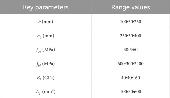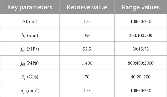 The parameters in the calculation model of flexural capacity of beam include b, h0, fcu, ffd, Ef, and Af. The sensitivity analysis parameter values are shown in Table 8. For the analysis, each parameter’s range was set to 50% of its initial value, while others were derived from the parameter information space. For example, for parameter b, the initial value is 100 mm, with a variation of 50 mm, resulting in a range from 100 mm to 250 mm. The values for h0, fcu, ffd, Ef, and Af are respectively 350 mm, 52.5 MPa, 1400 MPa, 70 GPa, and 175 mm2.