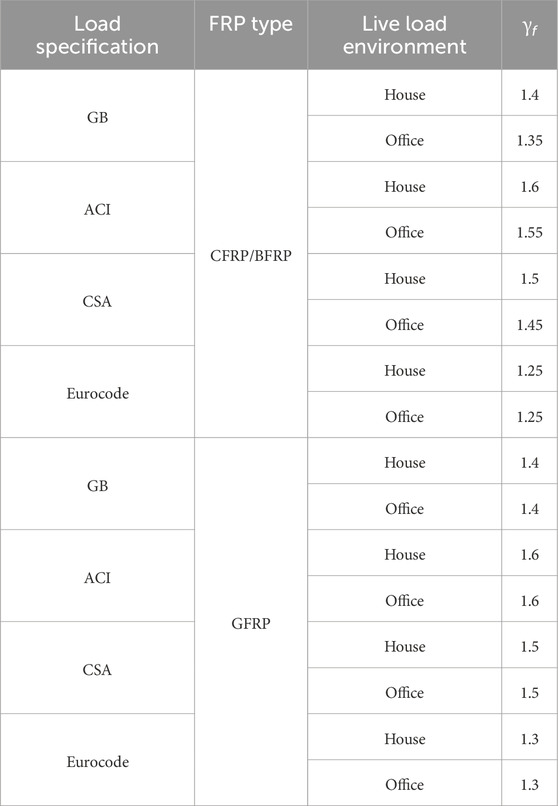 In the process of calibrating the material partial factor γf for SWSSC, the target reliability index βT must first be defined. The target reliability index is used to reflect the acceptable probability of structural failure for people. Taking a large number of ordinary buildings as an example, the standard (GB 50068-2018, 2018) stipulates that the target reliability index for ductile failure components is 3.2 (failure probability of 6.9 × 10−4), and the target reliability index for brittle failure components is 3.7 (failure probability of 1.1 × 10−4). Based on previous study (Zhang W. et al., 2022), the failure mode of FRP concrete beams under bending is brittle failure. Therefore, the target reliability index of 3.7 was determined.