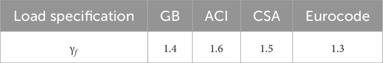 The recommended values for the SWSSC partial factor γf are listed under different load partial factor standards and varying live load environments. It can be observed that the recommended values are relatively close under different live load environments. In contrast, the influence of different load partial factor standards on the recommended values is significant. To facilitate the application of these analysis results in practical engineering, a comprehensive recommended value for the SWSSC partial factor γf under various load partial factor standards is provided in Table 12.