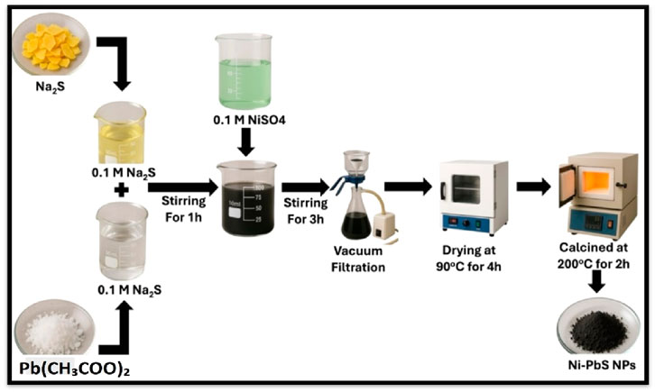 Ni doped PbS catalyst was synthesized by using chemical synthesis route. Initially, 0.1 M lead acetate dissolved in 25 mL water and in other beaker, 0.1 M sodium sulfide was dissolved in 25 mL water. Both the solution was sonicated for 15 min and then mixed both solutions and further stirred for 1 h. Subsequently, a 0.2 M solution of NaOH in 10 mL of water was prepared and added to the mixture. The resulted solution was stirred for 3 h at room temperature. In parallel, a separate solution of 0.1 M NiSO4 was prepared in 50 mL of water and stirring the mixture for 30 min. This NiSO4 solution was then carefully mixed with the previously prepared mixture and stirred for an additional 3 h to facilitate the formation of Ni-PbS. After 3 h reaction period, the resulting solution underwent filtration to isolate the Ni-PbS product. The product was then washed thoroughly with distilled water and dried in a hot air oven for 3–4 h. Finally, the crystals of Ni-PbS were collected and subjected to calcination at 200 °C for 2 h. For the synthesis of PbS, the above process was repeated without the addition of NiSO4. Figure 1 shows the schematic diagram for the synthesis of Ni-PbS.