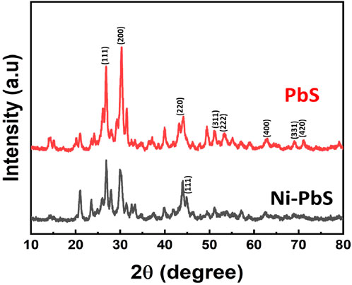 The XRD patterns of the as-synthesised PbS nanoparticles (Figure 2) exhibit broad diffraction peaks typical of nanocrystalline materials, which can be indexed to the face-centred cubic (fcc) phase of PbS. The main peaks appear at 2θ values of ∼24.9°, 26.9°, 30.5°, 40.0°, 45.9°, 50.2°, 62.7°, 71.7°, and 79.2°, corresponding to the (111), (200), (220), (311), (222), (400), (331), and (420) planes, respectively (Salavati-Niasari et al., 2008), in good agreement with standard JCPDS data, confirming the formation of phase-pure PbS. The broadness of these peaks reflects the small crystallite size, which enhances surface-to-volume ratio and benefits photocatalysis. For Ni–PbS, the diffraction pattern retains the fcc structure but shows subtle modifications: an additional signal near the (111) plane and slight peak shifts, without any secondary phases related to Ni or NiO (Ubale, 2012; Mohammed et al., 2018), indicating successful Ni incorporation into the PbS lattice rather than forming separate phases. A notable change is the shift in preferential orientation from the (200) plane in pristine PbS to the (111) plane in Ni–PbS, along with variations in relative peak intensities. These changes, together with shifts toward higher 2θ values, arise from lattice contraction due to substitution of larger Pb2+ ions (∼1.19 Å) with smaller Ni2+ ions (∼0.69 Å). This contraction modifies interplanar spacing, crystallite growth, and electronic structure while preserving the overall fcc framework (Ahmad and Niaz). Such structural tuning by Ni doping is directly linked to enhanced charge separation and improved photocatalytic activity.