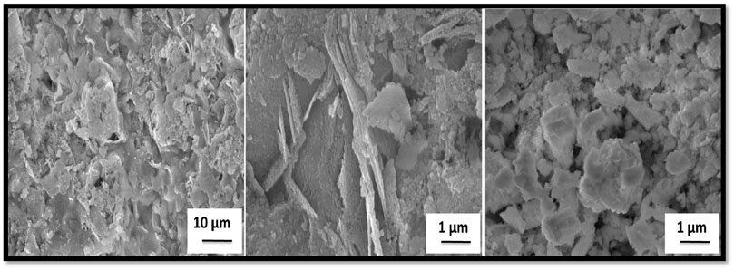 FE-SEM was employed to investigate the microstructural features of the samples, with particular attention to morphology. Figure 3a presents the SEM micrographs of Ni–PbS, which reveal an uneven distribution of particles with varying sizes and shapes. In Figure 3b, taken at the same magnification but from a different region, another dominant morphology is observed. The structure is primarily composed of thin, flat nanoflakes or nanosheets (Kuppan et al., 2014), which tend to agglomerate into larger three-dimensional clusters resembling “flower-like” or “rosette-like” architectures. Such hierarchical self-assembly, frequently reported for wet chemical synthesis methods, generates a material with a significantly enhanced effective surface area (Kumar et al., 2016). This high surface area facilitates greater adsorption of TMX molecules and provides more active sites for photocatalytic reactions. Furthermore, the interconnected flake-like network promotes light harvesting and efficient charge transport, thereby reducing electron–hole recombination. Although this morphology is commonly observed in PbS-based nanostructures, the distinctive aspect of the present work lies in the synergistic role of Ni incorporation. Nickel doping introduces lattice distortions and modifies the electronic structure of PbS, thereby complementing the surface-driven effects of the nanoflake morphology and leading to enhanced visible-light photocatalytic degradation performance.