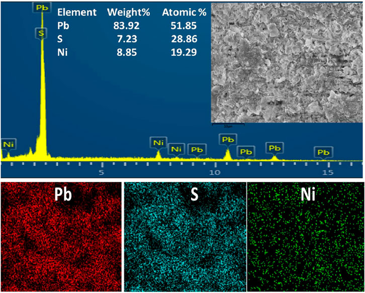 Figure 4 illustrates the EDX and mapping of Ni-PbS, which demonstrates the presence of lead, sulphur, and nickel elements in the sample. The weight percentages for Pb, S, and Ni are 83.92%, 7.23%, and 8.85%, respectively. Moreover, all the elements have homogeneous distribution throughout the catalyst surface.
