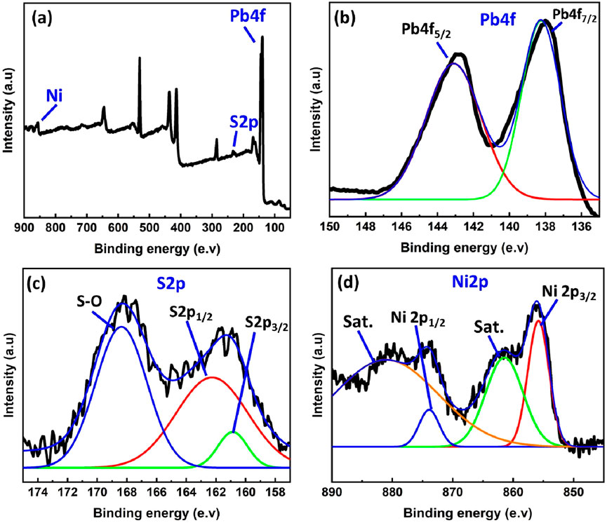 Figure 5. (a) Full XPS spectrum for Ni-PbS and deconvoluted XPS spectrum for (b) Pb 4f, (c) S2p and (d) Ni2p.