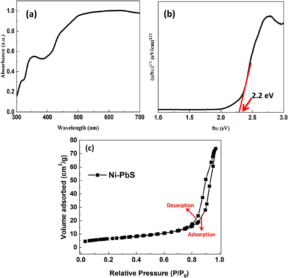 Figure 6. UV–Vis absorption spectra of PbS and Ni–PbS nanoparticles (a) and Tauc plot (b) of Ni-PbS and (c) N2 sorption isotherms for Ni-PbS.