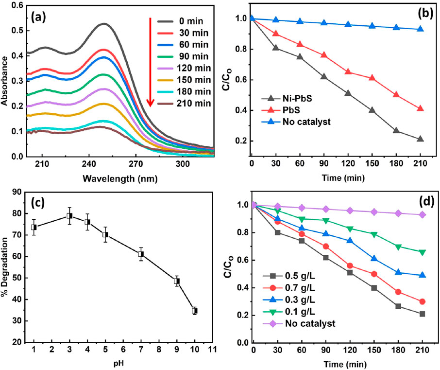 In contrast, the present work introduces Ni-PbS nanoparticles synthesized via a simple co-precipitation route and applies them, for the first time, to the visible-light-driven degradation of TMX. This dual novelty targeting a highly persistent neonicotinoid pollutant and demonstrating band-gap tuning through Ni incorporation differentiates our study from previous reports and highlights its environmental relevance.