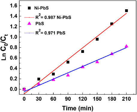 The pseudo-first-order kinetic model, represented as ln(C0/Ct) vs. time in Figure 8, was used to analyse the photocatalytic degradation kinetics of TMX over catalysts. The degradation process follows first-order kinetics, as confirmed by the linear fitting of the experimental data, which had strong correlation with regression coefficients (R2) of 0.987 for Ni-PbS and 0.971 for PbS. Ni doping effectively improves the charge separation and lowers recombination. It also produces more reactive species, as evidenced by the steeper slope seen for Ni-PbS. This indicates a larger rate constant compared to PbS. Ni-PbS shows the highest rate constant of 0.02225 min−1, whereas undoped PbS exhibits 0.01261 min−1 (Table 1). The higher photocatalytic efficiency of Ni–PbS over undoped PbS is further supported by this enhanced kinetic performance.