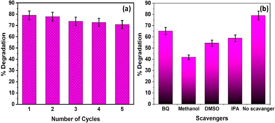Figure 9b presents the results of scavenger experiments designed to identify the primary reactive oxygen species (ROS) responsible for the degradation of TMX. The dominant degradation mechanism can be elucidated by introducing specific chemical scavengers that selectively quench different ROS. The control experiment with no scavenger shows the maximum degradation of 78.93%. Introducing Benzoquinone (BQ), a scavenger for superoxide radicals (O2•−), causes a moderate drop in efficiency to ∼65%. A more significant decrease to ∼59% is observed with Isopropyl Alcohol (IPA), a well-known scavenger of hydroxyl radicals (•OH). The most drastic inhibition occurs with the addition of Methanol, which reduces the degradation to ∼42%. Methanol is an efficient scavenger of photogenerated valence band holes (h+) (Mureithi et al., 2022). These results suggest that while multiple species are involved, the degradation of TMX is primarily driven by direct oxidation via valence band holes (h+), followed by attack from hydroxyl radicals (•OH). Superoxide radicals (O2•−) also play a role, but to a lesser extent. Therefore, it can be concluded that the valence band holes (h+) are the most dominant reactive species responsible for TMX degradation under visible light irradiation.