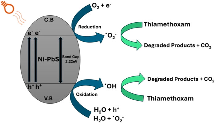 In this report, Ni-PbS nanostructures offer a promising yet unexplored strategy for TMX remediation. Ni2+ incorporation not only reduces PbS particle size and tunes the bandgap but also enhances charge separation and reactive oxygen species generation (Horoz et al., 2018). Moreover, the co-precipitation synthesis route provides a simple and scalable approach to prepare such doped sulfide nanoparticles. Previous studies have reported the advantages of Ni doping and PbS-based nanostructures for enhanced photocatalysis. For instance, Ni-modified g-C3N4 photocatalysts exhibited improved charge separation and visible-light activity (She et al., 2019), while PbS nanostructures have been explored for their tunable optical properties and photocatalytic behaviour (Parveen et al., 2018). However, these studies did not address the degradation of TMX, nor did they investigate Ni doping in PbS specifically for environmental remediation.