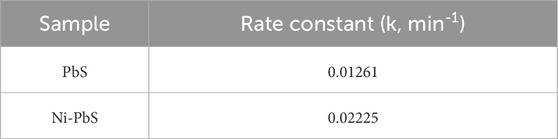 The photocatalytic efficiency of Ni-doped PbS against pure PbS and a control experiment with no catalyst (photolysis) is illustrated in Figure 7b. The plot of normalised concentration (C/C0) versus time shows that in the absence of a catalyst, TMX undergoes negligible degradation, indicating its stability against direct photolysis. While pure PbS shows moderate photocatalytic activity, achieving approximately 58.63% degradation (C/C0 ≈ 0.4) after 210 min, the Ni-PbS sample demonstrates significantly superior performance, degrading about 78.93% of the TMX (C/C0 ≈ 0.2) in the same period. The improved performance is likely due to nickel helping to separate charges more effectively, reducing recombination and boosting photocatalytic activity (Cui et al., 2024; Yao and Zhou, 2024). This improved charge separation leads to a higher quantum yield and, consequently, a more efficient degradation process (M’Bra et al., 2019).